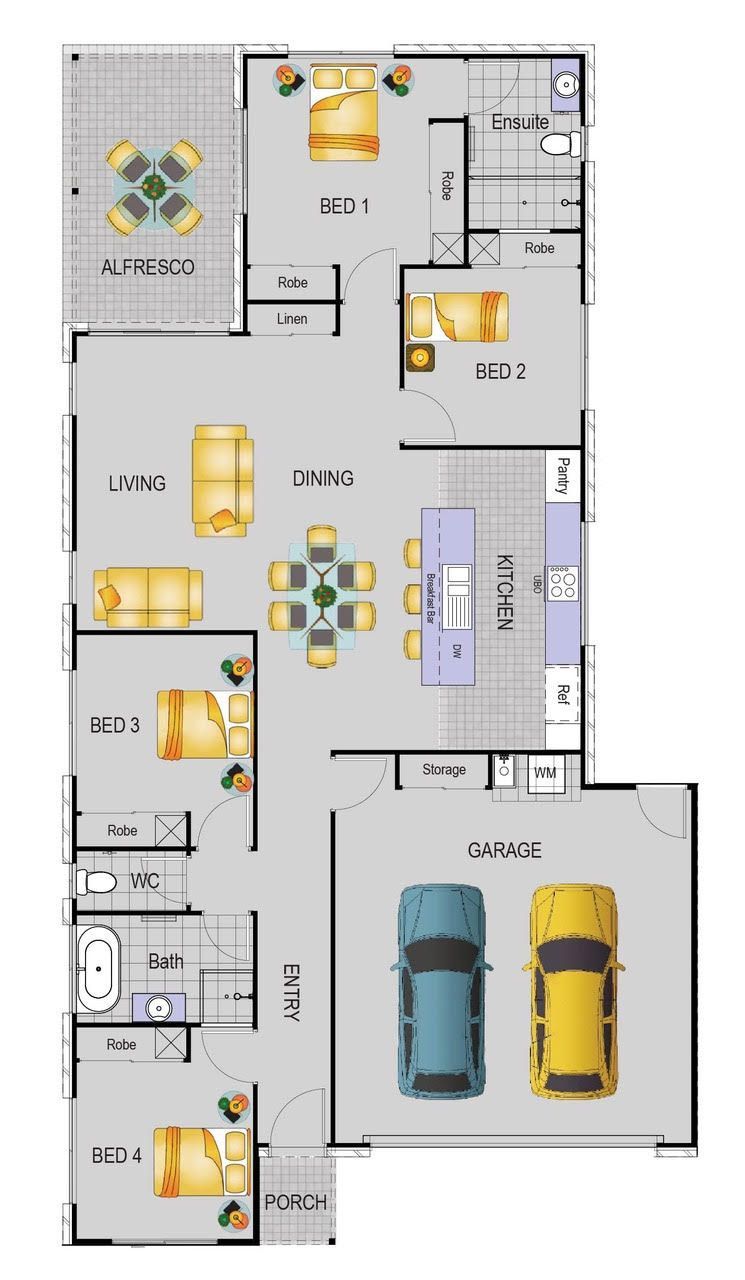 The Sanua is an intelligently designed four-bedroom home that balances practicality with modern architectural appeal. A standout feature of the design is the open-plan living and dining zone, enhanced by large stacker sliding doors that create a beautifully integrated alfresco space.