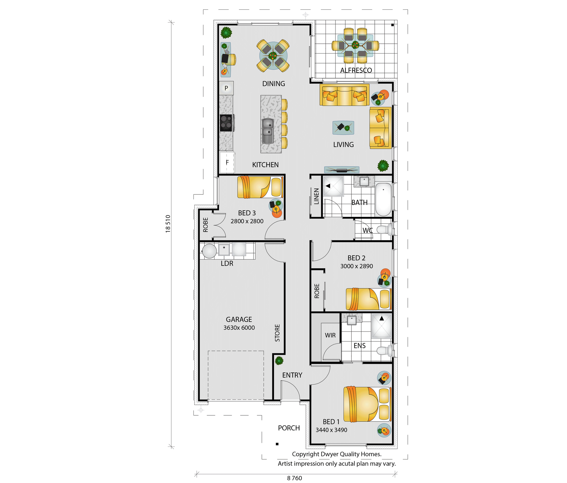 A contemporary, carefully planned three bedroom home delivering comfort, privacy and everyday liveability. Featuring a spacious master suite, open plan living, high raked ceilings and an outdoor alfresco area, this design balances style with practicality - ideal for both professionals and small families.