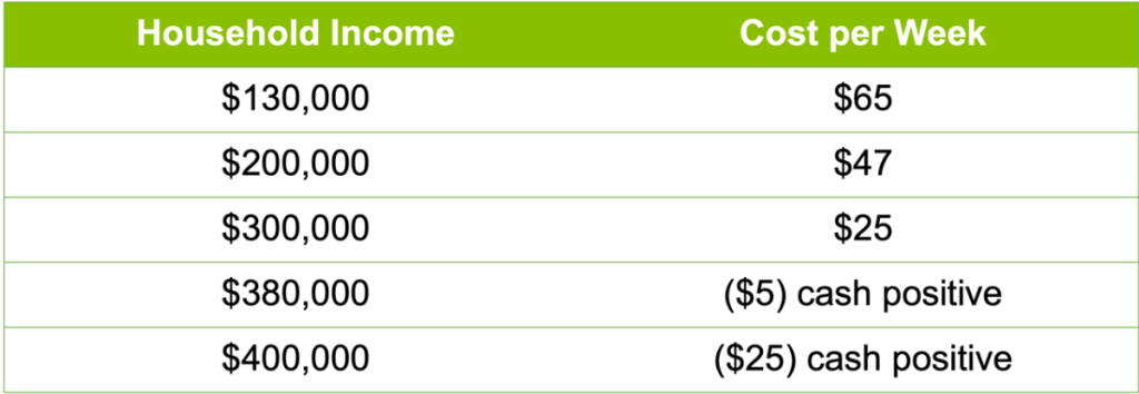 So if your household income is $130,000, owning an investment property will only cost you $65 per week. And because of the larger tax savings, higher income earners can be cash flow positive from day 1.